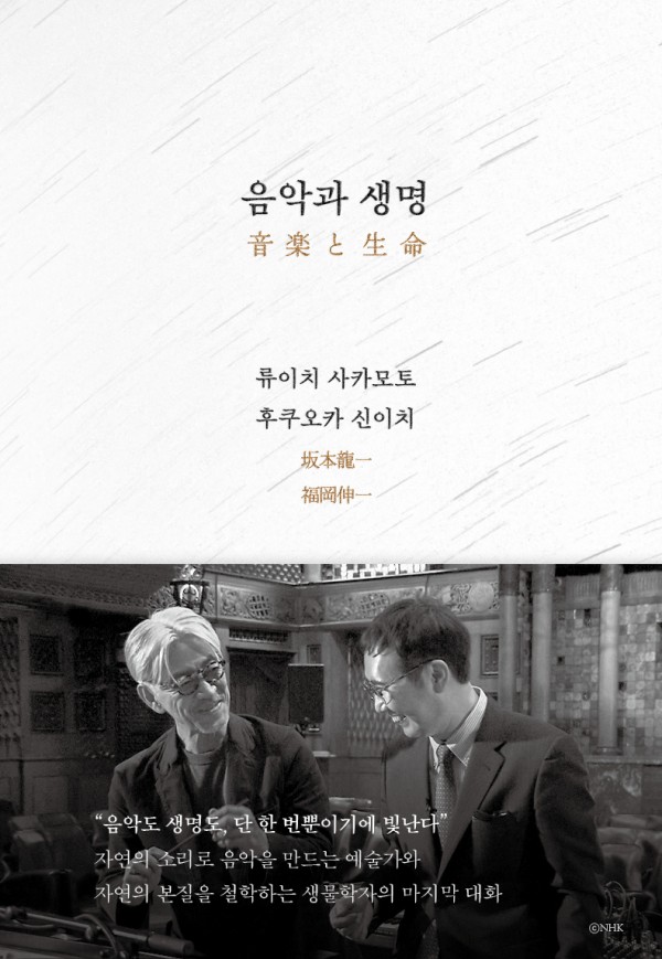 음악으로 시대를 풍미한 거장이자 열정적인 환경운동가, 사카모토 류이치와 '동적평형'의 생명철학으로 일본을 대표하는 생물학자 후쿠오카 신이치. 전혀 다른 분야에서 활동하는 두 사람의 대담을 기록한 '음악과 생명'이 지난 3월 28일 은행나무를 통해 국내에서 출간되었습니다.