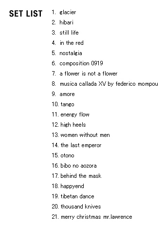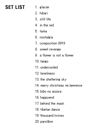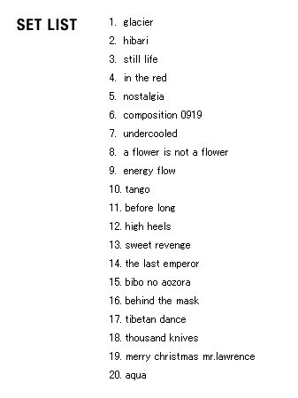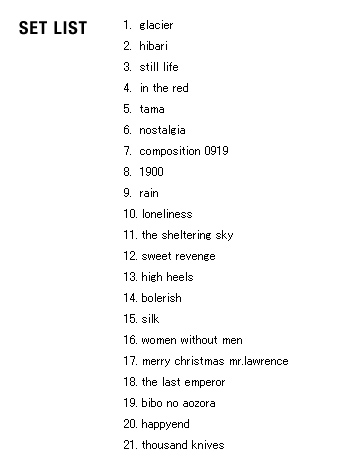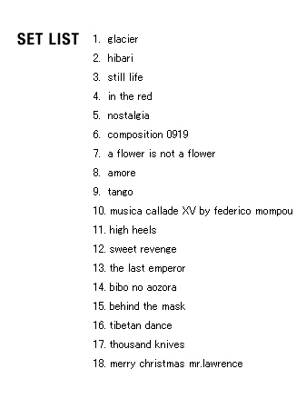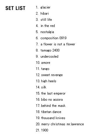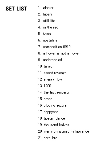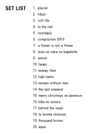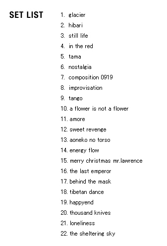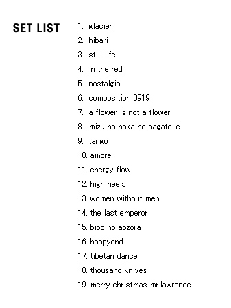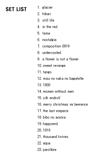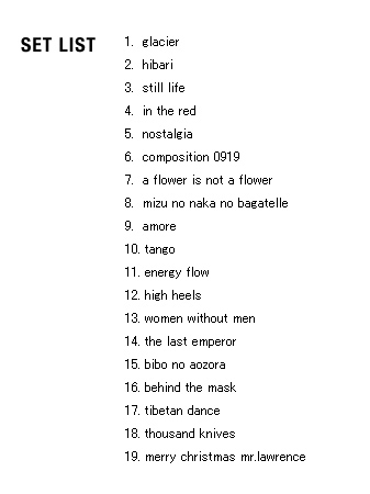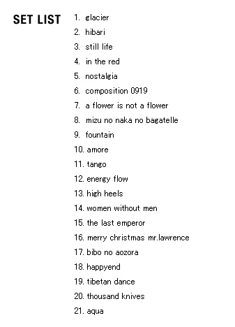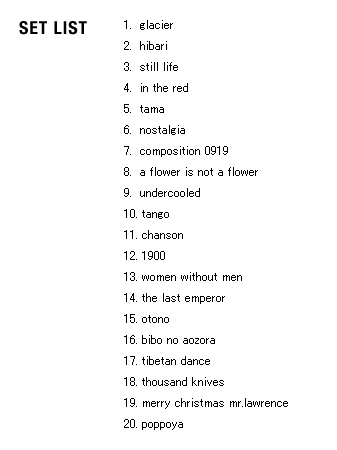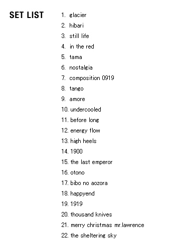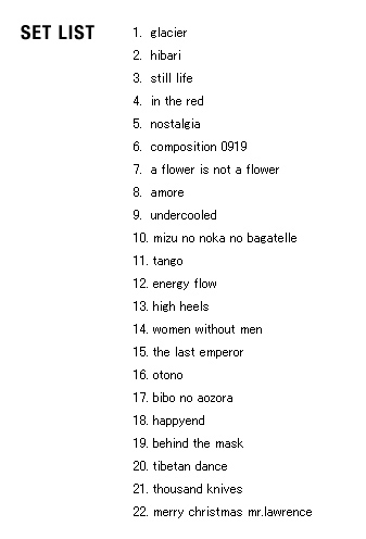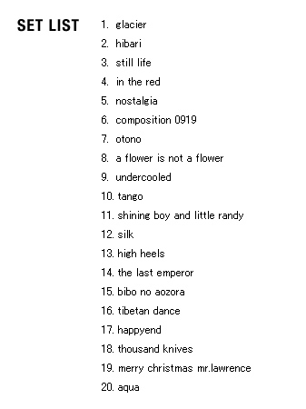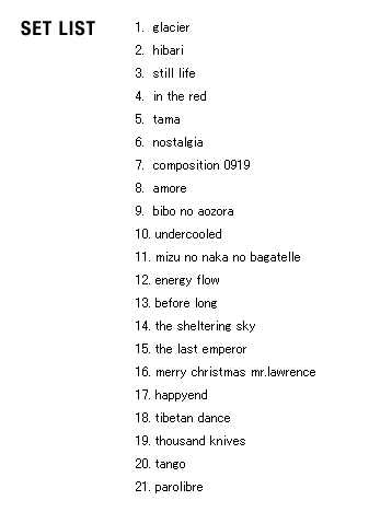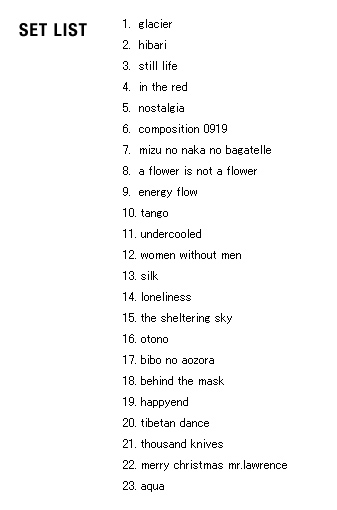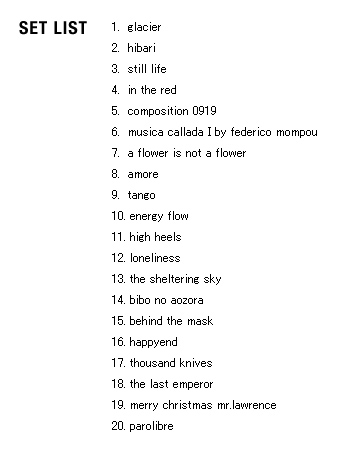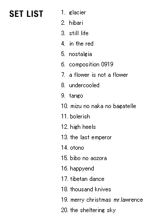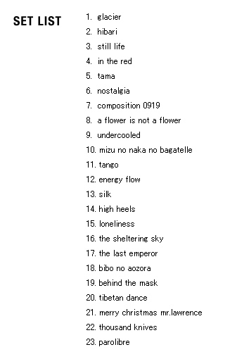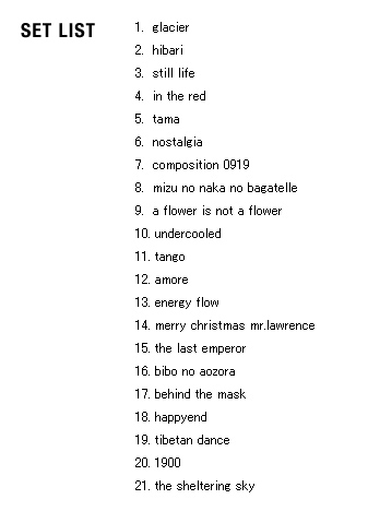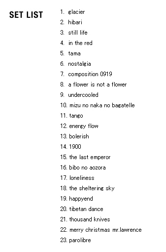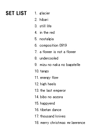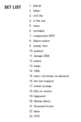 | 2005 Ryuichi Sakamoto Japan Tour 2005 in association with Artist Power Ryuichi Sakamoto (pf, keys, Computer Programming), Steve Jansen (ds, perc, Computer Programming), Christian Fennesz (g, Computer Programming), Skuli Sverrisson (b, g), Oyamada keigo (g), Horikiri Jun (Visual) |