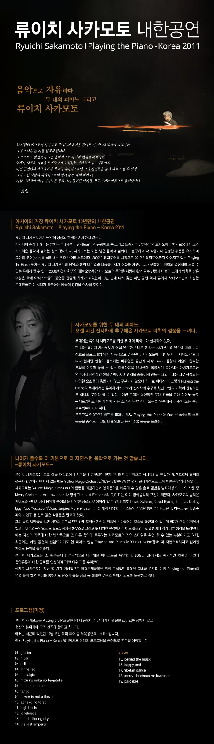 | 2011 Ryuichi Sakamoto : Playing the Piano 2011 - for the School Music Revival info ryuichi sakamoto, taeko onuki(25일, vocal), yoshihide otomo(26일, guitar), haruomi hosono(27일, guitar&vocal), tamami tono(28일, sho) | ||