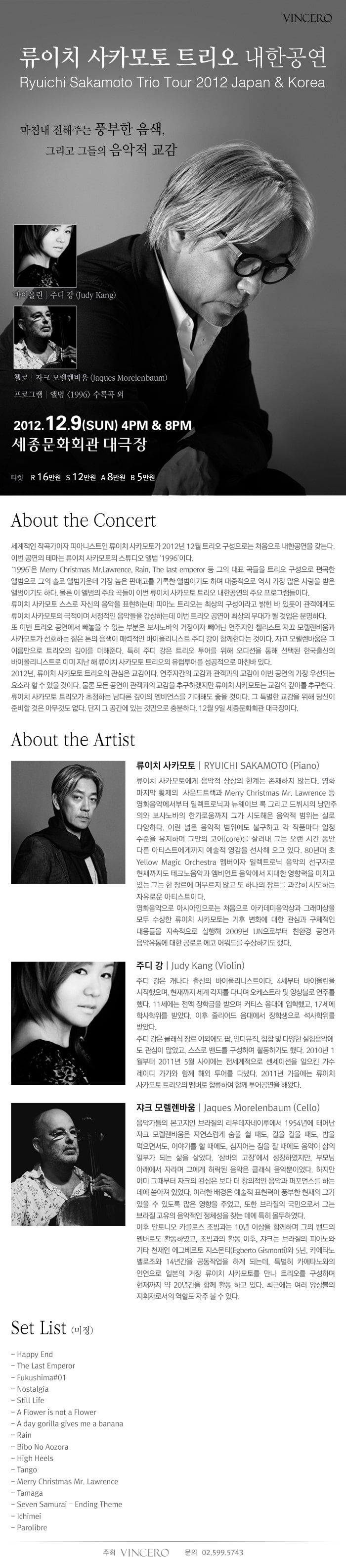 | 2011 Ryuichi Sakamoto Trio Tour 2011 ryuichi sakamoto(Piano), jaques morelenbaum(Cello), Judy Kang(Violin) | ||